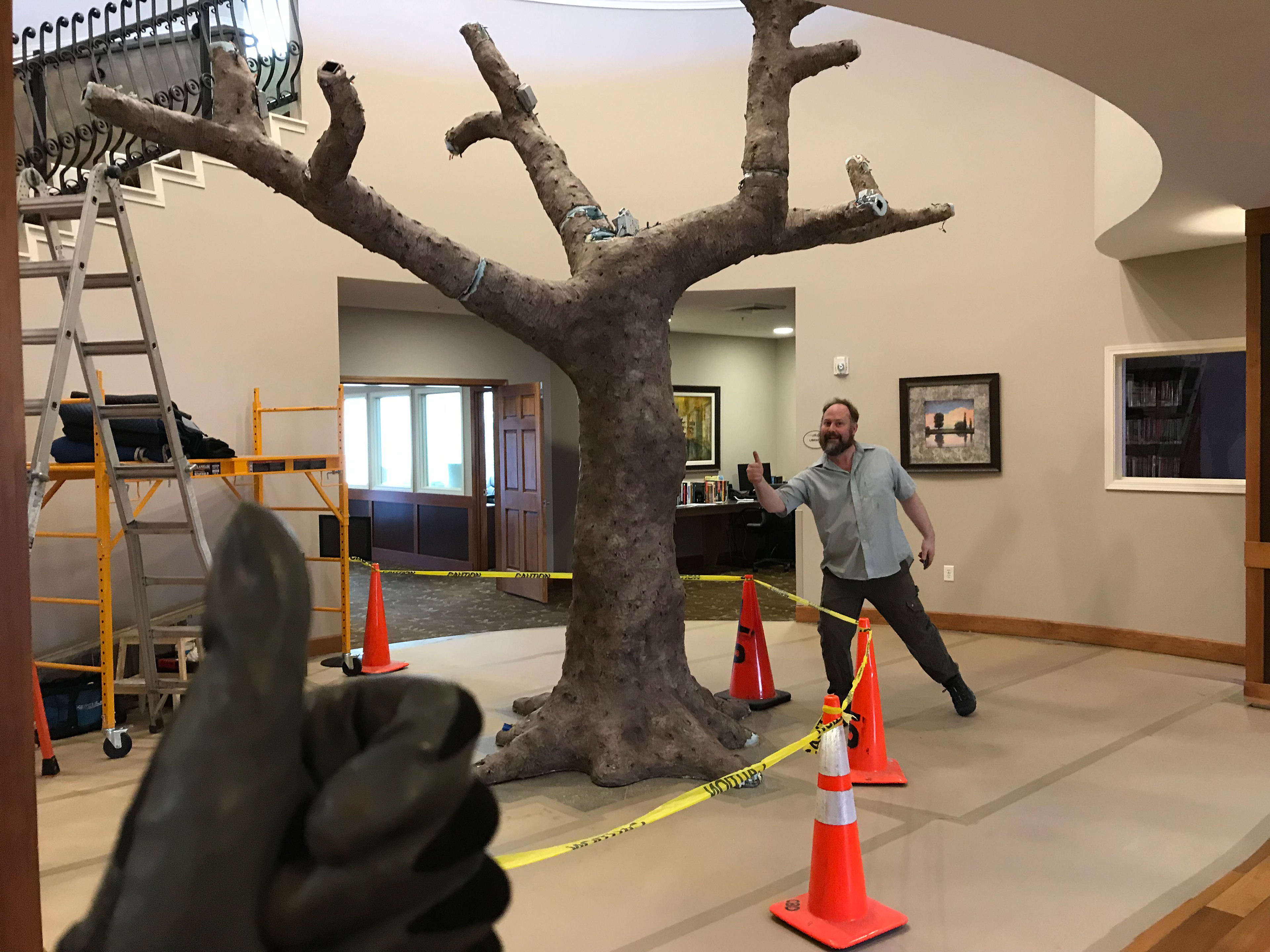 I helped bring to life this full-scale illuminated tree, now permanently installed in the lobby of a Senior Living Community. Scott Foster of Top-Loader, along with Mike Suri of Suri Iron, brought me on to help with the foam lay-up & carve, epoxy sculpt, light embedding, leaf install, scenic paint, transport and site installation.